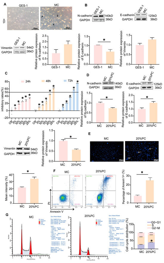 Background/Objectives: Periostracum Cicadae (PC) is commonly used to treat chronic atrophic gastritis (CAG), but its underlying mechanisms are unclear. We investigated the therapeutic effects, active ingredients and molecular mechanisms of PC on CAG. Methods: We analyzed the components in the serum extract of PC by UHPLC-Q-Orbitrap-MS/MS. Then, we used rat and cell models to assess the impact of PC on CAG and employed network pharmacology and bioinformatics to predict key targets and active ingredients. Finally, we confirmed hub targets through experiments and molecular docking. Results: A total of 22 components were identified in the PC extract-containing serum using UHPLC-Q-Orbitrap MS/MS. Network pharmacology combined with molecular docking revealed that the protective effect was primarily mediated by three compounds: (Z)-akuammidine, chicoric acid, and columbianadin. And we revealed that c-Fos/c-Jun signaling pathways were crucial in therapy. PC extract-containing serum inhibited the vitality, migration, invasion, and multiplication of MC cells (model cells for CAG), induced apoptosis, and caused G0/G1 phase cell cycle arrest. The expression level of tumor necrosis factor-alpha (TNF-α), interleukin-6 (IL-6), interleukin-1 beta (IL-1β) and gastrin 17 (G17) in the serum of CAG rats increased, while the expression level of pepsinogen I (PG I) and pepsinogen II (PG II) decreased. After 12 weeks of PC administration, these conditions were significantly improved. PC not only reduced the levels of antigen KI-67 (Ki67) and tumor protein p53 (P53) but also enhanced SRY-box Transcription Factor (SOX2). Simultaneously, PC down-regulated the expression of N-cadherin and Vimentin while up-regulating that of E-cadherin. Conclusions: PC inhibited epithelial–mesenchymal transition (EMT) via the c-Fos/c-Jun signaling pathway, thereby providing therapeutic benefits for CAG. Our study elucidates the mechanisms and material basis of PC in treating CAG, providing experimental evidence to support its clinical application.